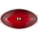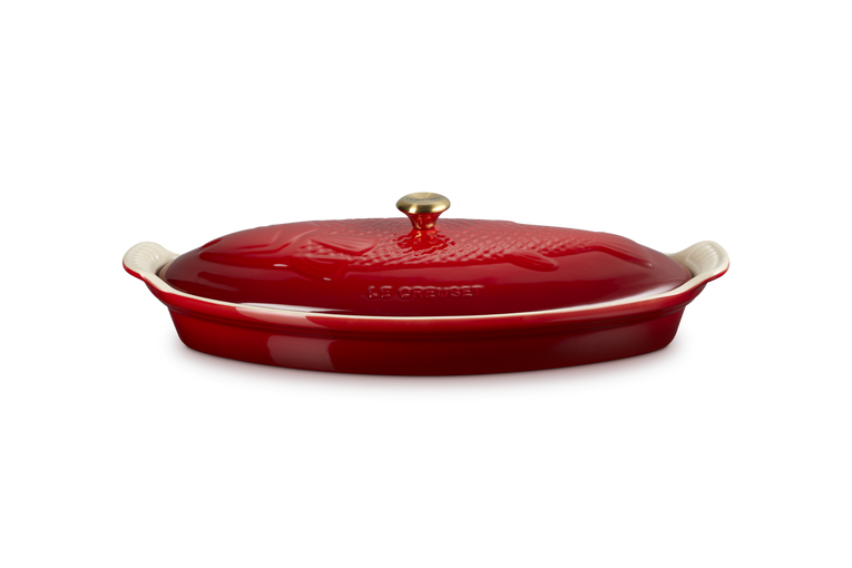 Эта рельефная посуда украшена изящным изображением рыбы и элегантной золотой ручкой, что придаёт ей выразительный и утончённый вид. Она идеально подходит для запекания  рыбы, а также овощей и мяса. Ребристое дно приподнимает продукты, обеспечивая равномерное приготовление, а крышка помогает сохранять влагу и сочность блюд.